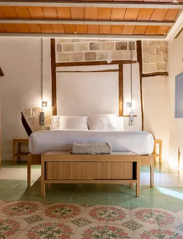 Los techos con vigas vistas y la iluminación envolvente evocan una sensación de sosiego, mientras que la comodidad de su cama y la armonía de cada detalle te transportan a un espacio pensado para desconectar del mundo. Aquí, la historia y el confort se funden en una experiencia única para hacerte redescubrir el placer de lo esencial y vivir el lujo de la tranquilidad. En esta habitación no se aceptan niños.